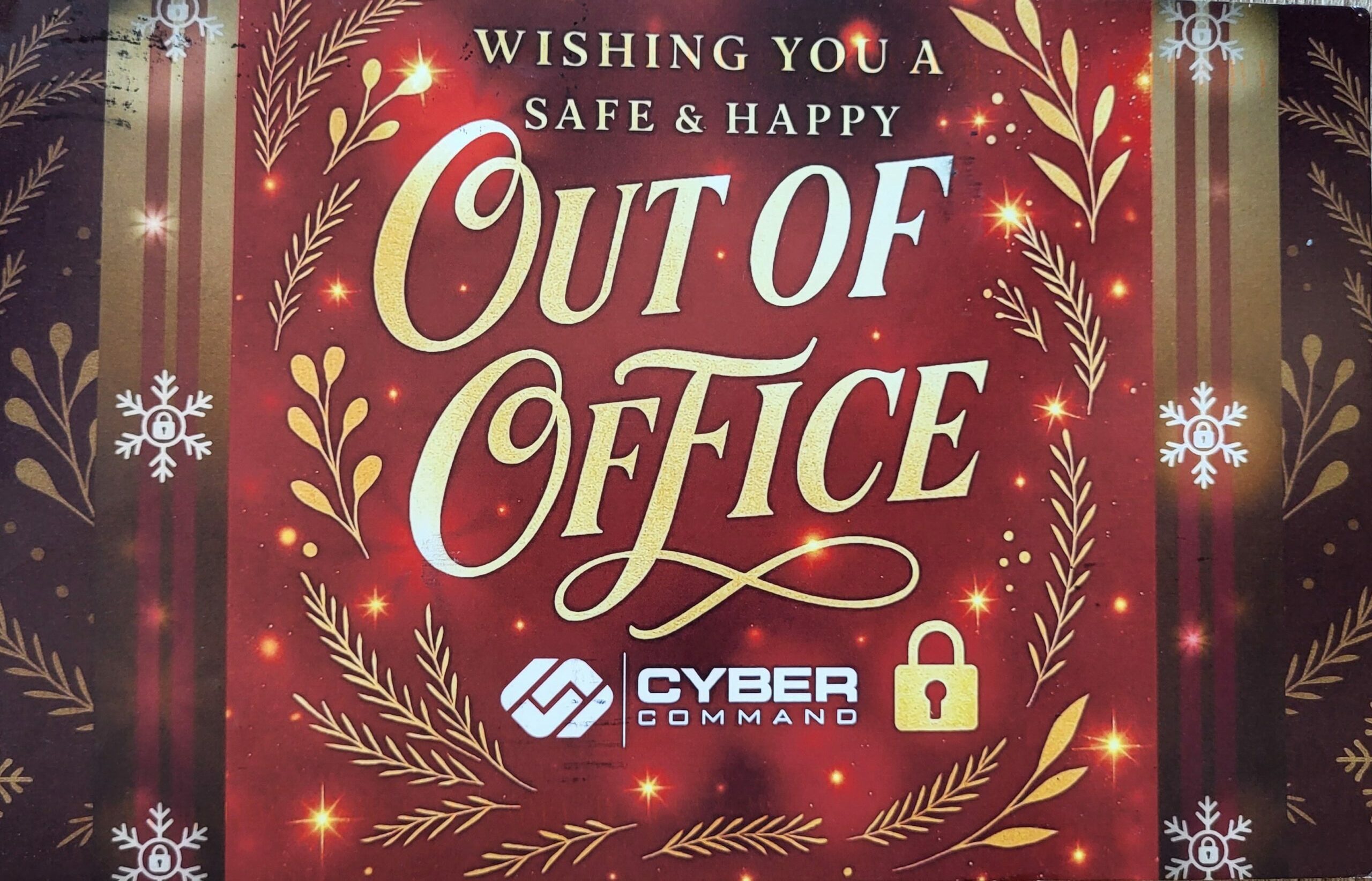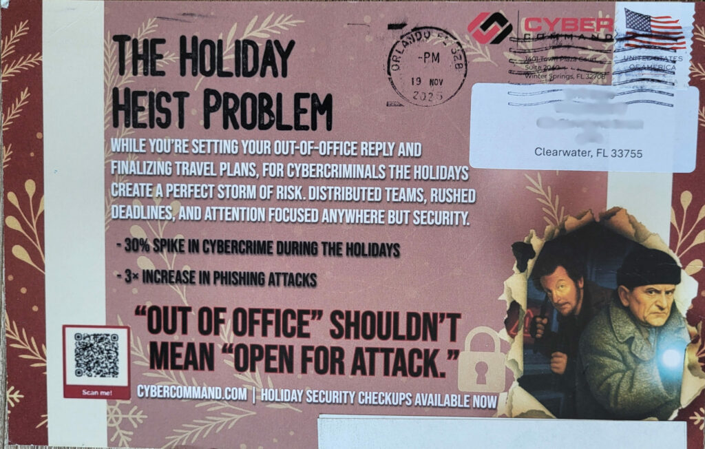 The back of the postcard drops compelling—and slightly alarming—stats about the spike in cyberattacks when teams are out on vacation, understaffed, or distracted by end-of-year chaos.