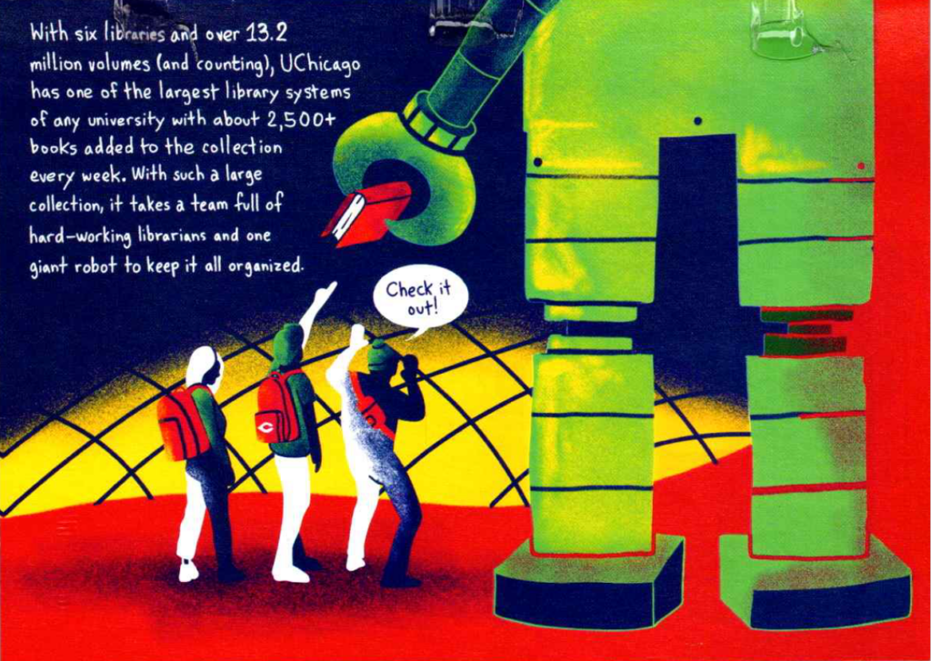 An old-school illustrated robot towers over tiny students, books in hand, immediately blending humor, imagination, and scale. Instead of listing stats in a dry, institutional way, UChicago uses storytelling to explain the sheer magnitude of its library system—over 13.2 million volumes, thousands more added weekly, and a system so advanced it requires both expert librarians and a literal giant robot to keep things running smoothly.