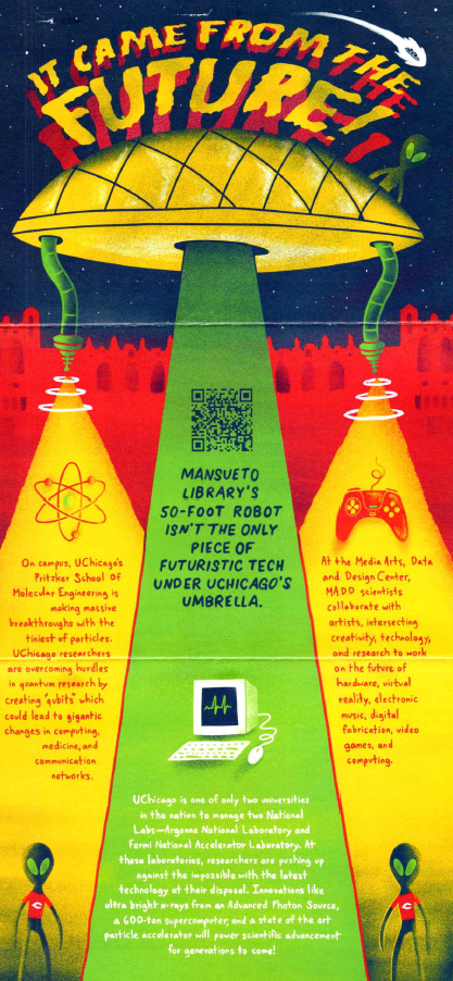 Within the beam of light, readers learn that the 50-foot robot is just one piece of UChicago’s forward-thinking ecosystem. From the Molecular Engineering School to the Media Arts, Data, and Design Center (yes, the MADD scientists!), the brochure connects creativity, science, and innovation under one cohesive narrative.