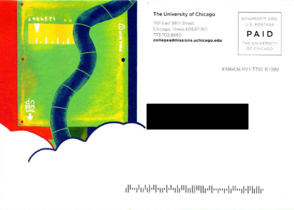 This time, we’re spotlighting a brochure from the University of Chicago, and from the instant it hits the mailbox, it’s clear this piece was engineered to interrupt autopilot and earn a real, tactile moment of attention.