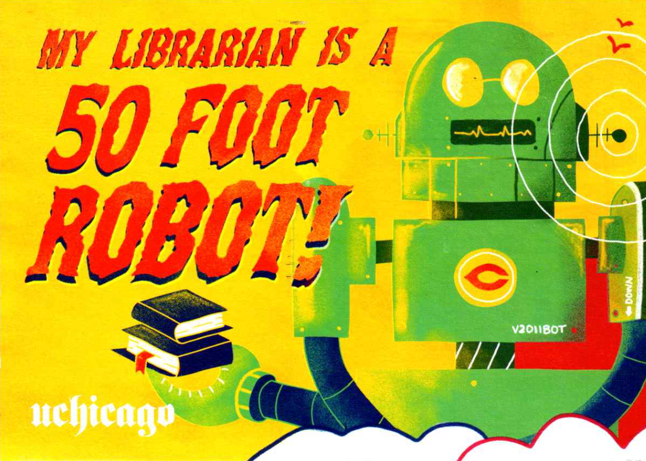 An old-school illustrated robot towers over tiny students, books in hand, immediately blending humor, imagination, and scale. Instead of listing stats in a dry, institutional way, UChicago uses storytelling to explain the sheer magnitude of its library system—over 13.2 million volumes, thousands more added weekly, and a system so advanced it requires both expert librarians and a literal giant robot to keep things running smoothly.